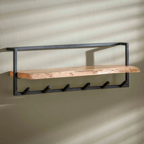 Deze boomstam kapstok brengt veel sfeer naar je hal! De plank is gemaakt van massief acaciahout in een natuurlijke vorm en met natuurlijke kleurvariaties. Het frame van geschuurd metaal geeft de kapstok een industriële uitstraling. Hang je jassen, tassen en sjaals aan de zes haken; op de boomstam plank is plaats voor mutsen en hoedjes. Elk exemplaar is uniek!