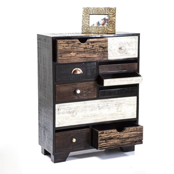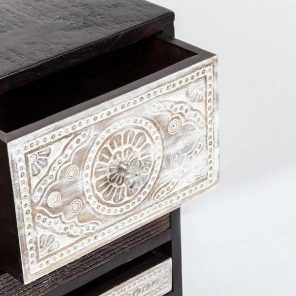 De Kare Design Finca 10D ladekast zit boordevol sfeer en karakter. In het frame van donker mangohout komen de lichtere lades prachtig uit, en als je dichterbij komt kun je genieten van het unieke houtsnijwerk- met de hand vervaardigd. Het dressoir heeft 10 lades en een omvang van 70 bij 90 centimeter: leuk in de woonkamer, in de hal of bij je werkplek!