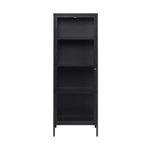 Deze glazen wandkast is slechts 58 centimeter breed: ideaal voor tegen die smalle muur in de woonkamer. Zet er je mooiste kunst en favoriete boeken in, zodat je elke dag vrolijk wordt van deze glazen wandkast. Of geef de kast een plekje in de eetkamer en gebruik voor het goede servies. De gouden handgrepen vormen een chique detail.