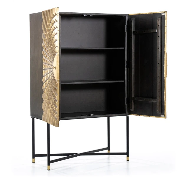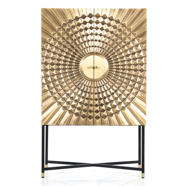 De Eleonora Noa kast is in staat een saaie woonkamer compleet te transformeren. De gouden deuren met reliëf patroon zijn het zonnetje in huis! Slanke, hoge poten geven de kast een ruimtelijk design. Berg er spelletjes in op of zet de gouden kast in de eetkamer en gebruik voor serviesgoed. In de drie ruime vakken achter de deuren kun je heel wat spullen opbergen.