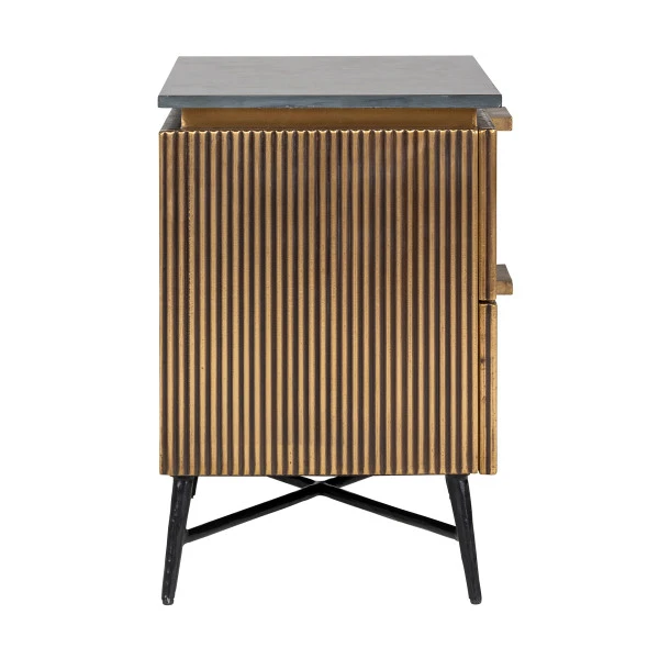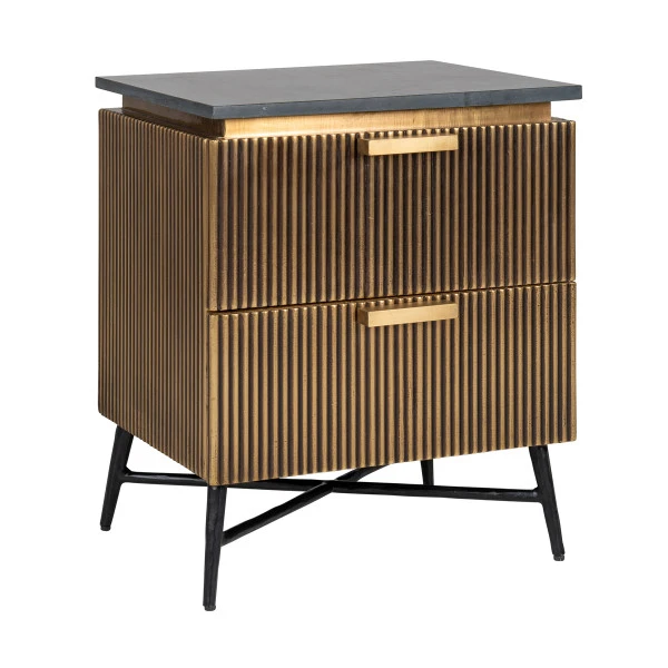 Wat de meubels uit de Richmond Interiors Ironville serie bijzonder maakt zijn de luxe materialen. Hout bekleed met metaalplaat zorgt voor een gouden gloed; een blad van echt marmer maakt de stijl compleet. Combineer het nachtkastje met een bijpassend dressoir of een wandkast met gouden ribbelmotief!