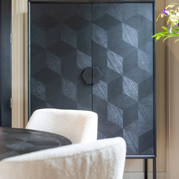 Kenmerkend voor de Richmond Interiors Blax serie is het hoogwaardige eikenfineer met een subtiel, geometrisch patroon. In het zwart hout zie je ook de prachtige lijnen van de natuur nog mooi terug. Combineer de grote kast met een bijpassende salontafel en bijzettafel!