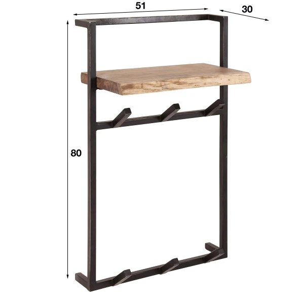 Met deze hoge kapstok van zwart metaal en een boomstam plank creëer je een industriële look in de hal. Aan de zes haken kun je jassen en tassen hangen; op de boomstam plank is plaats voor handschoenen, hondenriemen en hoedjes. Of zet er juist een gezellige decoratie op!