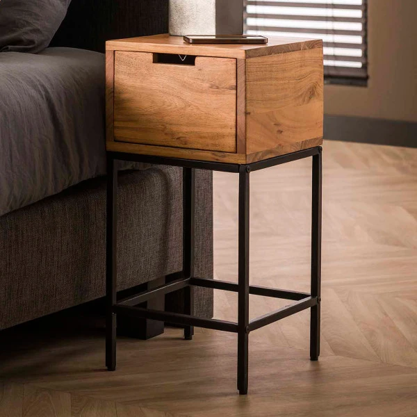 Een klein nachtkastje voor de compacte slaapkamer! Ondanks het formaat is dit nachtkastje een echte sfeermaker; dat komt door het acaciahout vol kleur en karakter. Op stoere poten van metaal brengt het nachtkastje een industriële look naar je slaapkamer. Maar je kunt het ook heel goed combineren met een landelijk of stoer modern interieur.