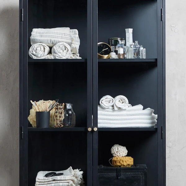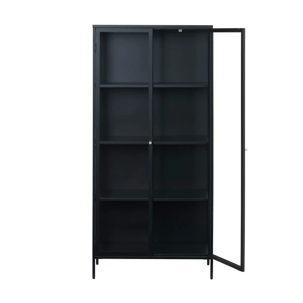 In deze metalen vitrinekast komen je boeken, souvenirs en servies prachtig tot recht. Het zwarte metaal vormt een mooi contrast met elke andere kleur. Bovendien staan je spulletjes stofvrij achter de glazen deuren. De vitrinekast heeft een breedte van 90 centimeter en past mooi in een modern- industrieel interieur. Ideaal voor je beste borden en glazen in de eetkamer! Of zet je de vitrinekast liever in de woonkamer?
