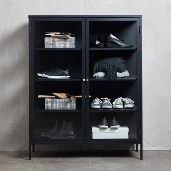 Deze metalen wandkast heeft 8 vakken voor schoenen, boeken, linnengoed of servies: wat jij maar wenst. Een handige kast voor op de slaapkamer, of een stijlvolle aanwinst voor de woonkamer wanneer je de vakken vult met mooie spulletjes! De glazen deuren zijn voorzien van gouden handgrepen, die voor een chique detail zorgen in het stoere geheel.