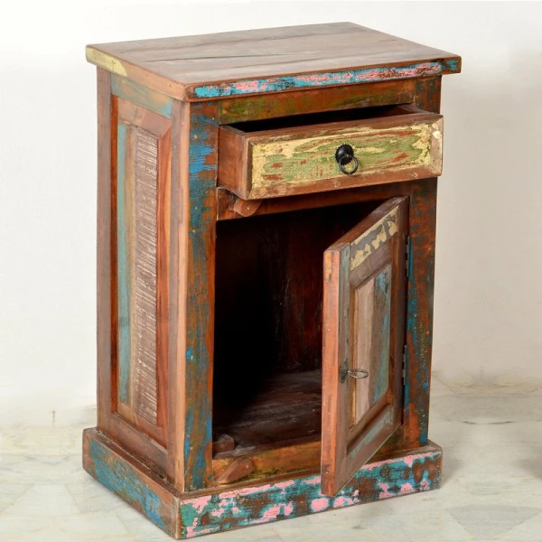 Naast dit nachtkastje van Indiaas sloophout kun je niet anders dan heerlijk dromen over verre reizen en warme landen. De planken van oude vissersboten zijn met de hand bewerkt tot een gezellig nachtkastje, dat de vrolijke kleuren van het verre India nog steeds draagt. Elk exemplaar is uniek, met een eigen verhaal en karakter.