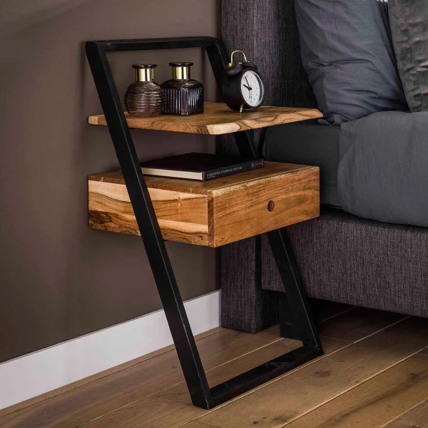 Een sfeervol nachtkastje met een industrieel design: daar wordt je slaapkamer gezelliger én mooier van! Het nachtkastje is gemaakt van massief acaciahout met een matte, beschermende coating. Een stoer onderstel van robuust metaal geeft het nachtkastje haar industriële uitstraling. Met een plankje, open vak en lade biedt het nachtkastje veel ruimte voor je spulletjes.