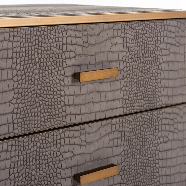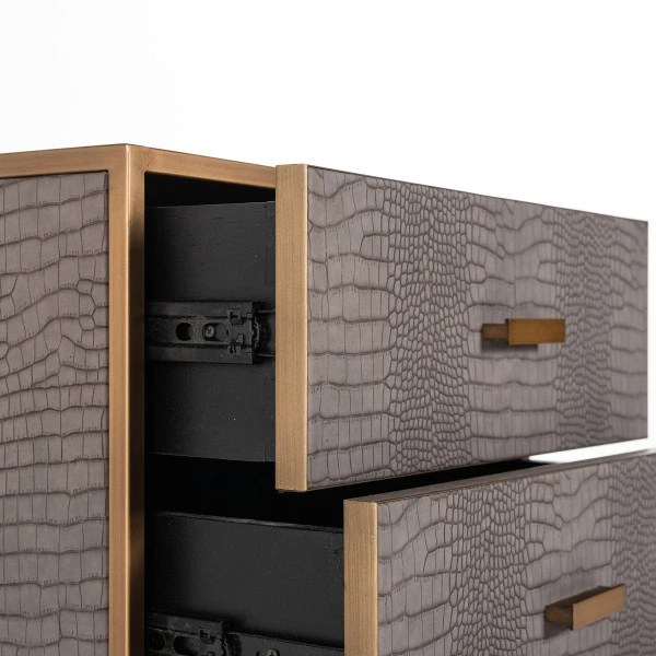Met het Richmond Interiors Classio nachtkastje naast de zijden lakens op je bed krijgt je slaapkamer wel een hele luxe uitstraling. De bekleding is gemaakt van hoogwaardig kunstleer met een voelbare slangenleer- structuur; een omlijsting van goud maakt het nachtkastje compleet! In de drie lades is alle ruimte voor boeken, nachtcrèmes en opladers. Je kunt het meubel ook als ladekast gebruiken in de woonkamer.