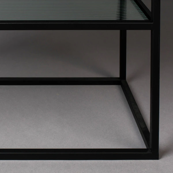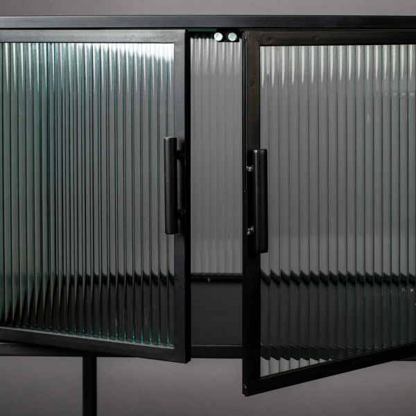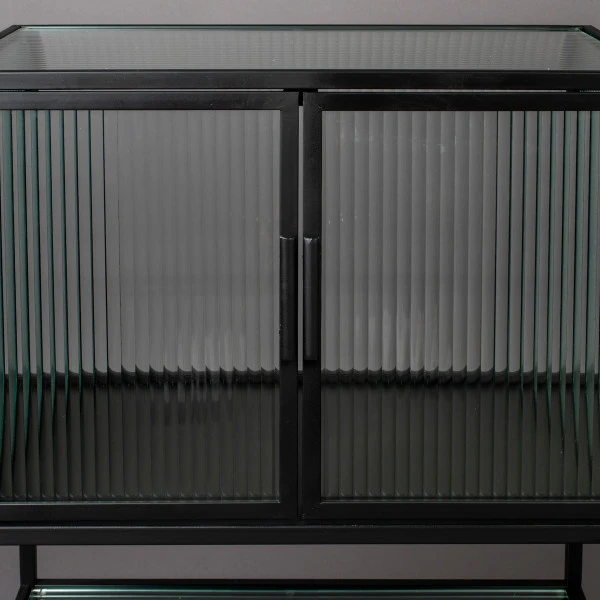 Je herkent de Dutchbone Boli serie aan de mix van zwart metaal en ribbelglas. Behalve deze compacte vitrinekast vind je in de serie ook een hoge wandkast, een ribbelglas dressoir en een klein wandkastje. Of zoek je nog een bijpassende salontafel?