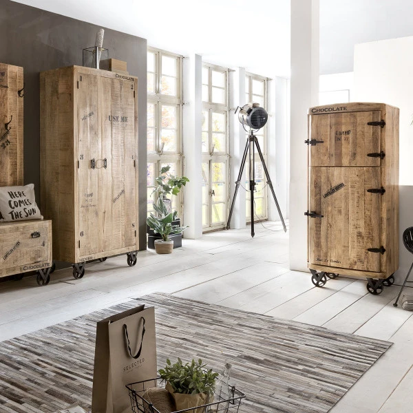 Net als deze hoge wandkast hebben de andere meubels uit de Lavis Porter serie een industriële uitstraling. Zwarte details, zoals tekst of metalen wielen, vormen een speels contrast met het hout. Kijk gauw verder voor een bijpassend dressoir en een industriële eettafel!