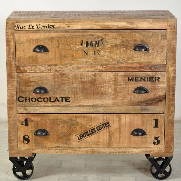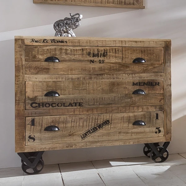 Een industriële ladekast met een robuust design en speelse tekst op het hout. Ook de spijlen aan de zijkant en de stoere wielen geven de ladekast karakter. Met een breedte van 90 centimeter en 3 lades kun je in de industriële ladekast veel kleding kwijt! Of gebruik het meubel als sfeermaker in de woonkamer en berg er rommel in op: opladers, speelgoed en post hebben voortaan een vaste plek in huis.