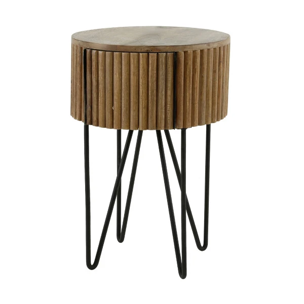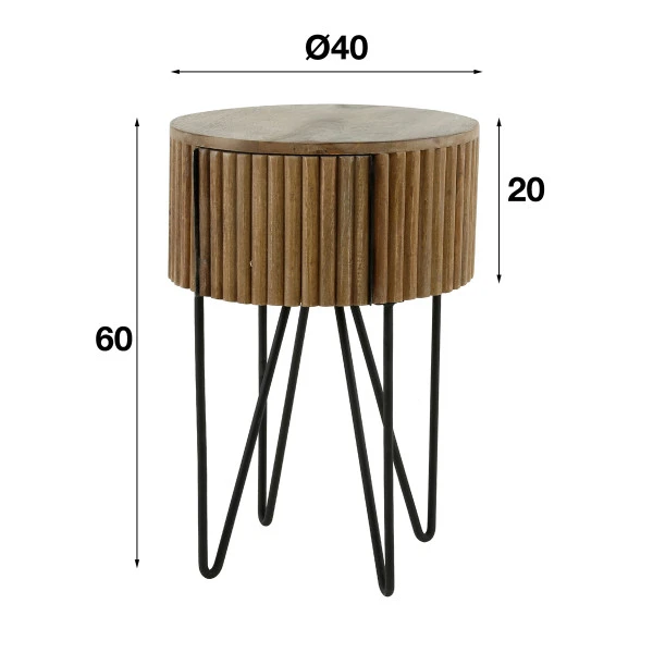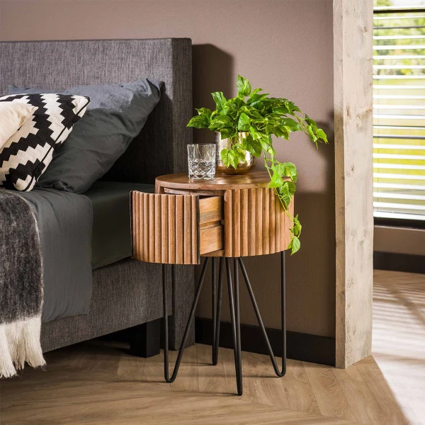 Dit nachtkastje is rond, wat voor een speels en origineel effect zorgt. Bovendien neemt het nachtkastje een bescheiden plaats in en schuif je het makkelijk even aan de kant om te stofzuigen! De stroken van mangohout geven het nachtkastje een gezellige uitstraling. Er zit een lade in verborgen, met plaats voor kleine spulletjes zoals oordopjes en je telefoon.