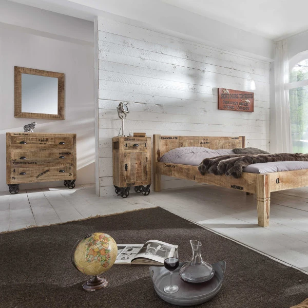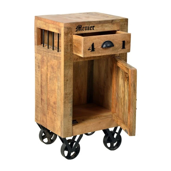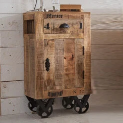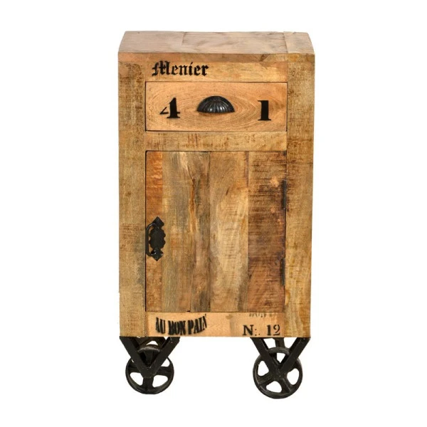 Dit nachtkastje geeft je slaapkamer een gezellige look die het midden houdt tussen rustiek landelijk en stoer industrieel. In het handbewerkt mangohout zie je de karakteristieke lijnen van de natuur goed terug, wat een mooi contrast vormt met de zwarte spijlen aan de zijkant en de gespoten letters. Metalen wielen geven een speelse draai aan het robuuste design.