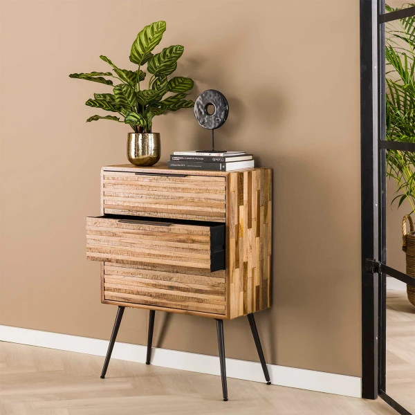 Dit ladekastje heeft een speels karakter en vormt zo een gezellige noot in je interieur. Het ladekastje is ingelegd met stroken teakhout met een warme en natuurlijke uitstraling. Een echte sfeermaker! Met een formaat van 60 bij 80 centimeter is het ladekastje lekker compact: ideaal voor die paar losse rommeltjes in de woonkamer. Of gebruik de 3 lades voor boeken en tijdschriften.
