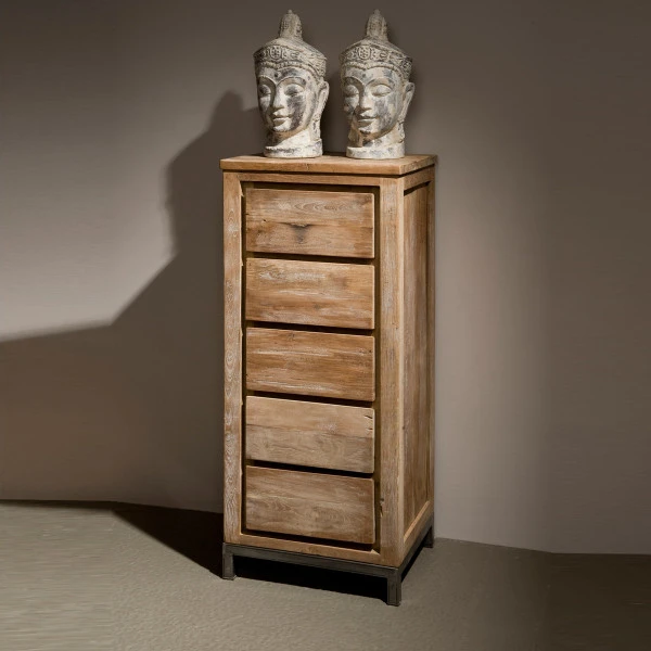 Deze ladekast heeft een rustieke uitstraling dankzij een ruwe afwerking van het Aziatisch teakhout. Het teakhout is bovendien gerecycled, zodat elk exemplaar volledig uniek is met subtiele variaties in de kleuren en lijnen van het hout. De combinatie met het metalen onderstel geeft de ladekast een industrieel tintje!