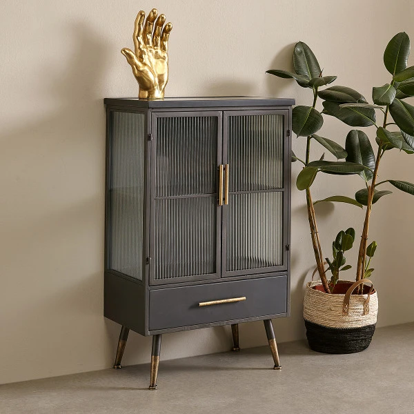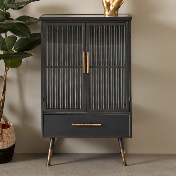 De Kare Design Gomera serie kenmerkt zich door een elegant design en een mix van materialen: zwart gepoedercoat staal, ribbelglas en messing. Combineer de wandkast met een wijnkast en dressoir voor een mooi en retro geheel in huis.