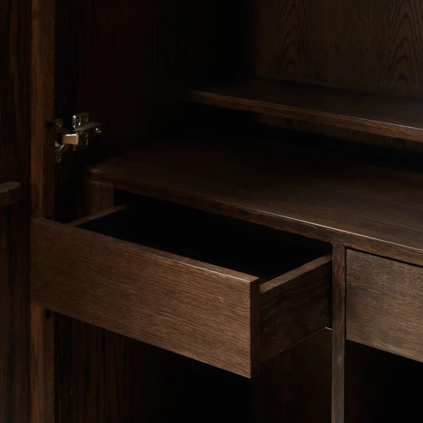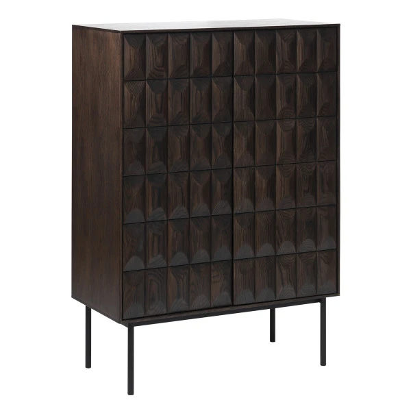Met deze wijnkast heb je alles bij elkaar wat je nodig hebt voor een lekker drankje. Achter de deuren van donkerbruin eikenfineer met reliëf is plaats voor wijn, sterke drank, wijnglazen, onderzetters, borrelglazen en onderzetters. Alles heeft een eigen plek; je grijpt nooit meer mis! Tenzij je een drankje teveel ophebt, misschien. Met een formaat van 90 bij 129 centimeter heb je altijd wel plaats voor deze wijnkast.