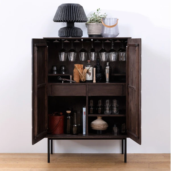- Wijnkast heeft achter de 2 deuren houders voor wijnglazen, ruimte voor flessen en 2 lades voor andere accesoires