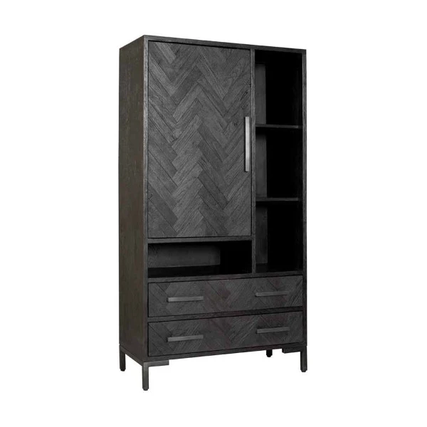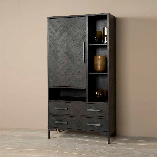 De Tower Living Ziano wandkast is een elegante sfeermaker in je interieur. Het zwarte hout met vissengraat patroon zorgt voor een chique effect, terwijl het asymmetrische design de wandkast een speelse look geeft. Berg wijnglazen en spelletjes weg achter de deur, en zet kleurrijke decoraties in de open vakken: van boeken tot vaasjes of kunst. In de lades kun je al die losse rommeltjes kwijt die anders je woonkamer zo ongezellig maken!